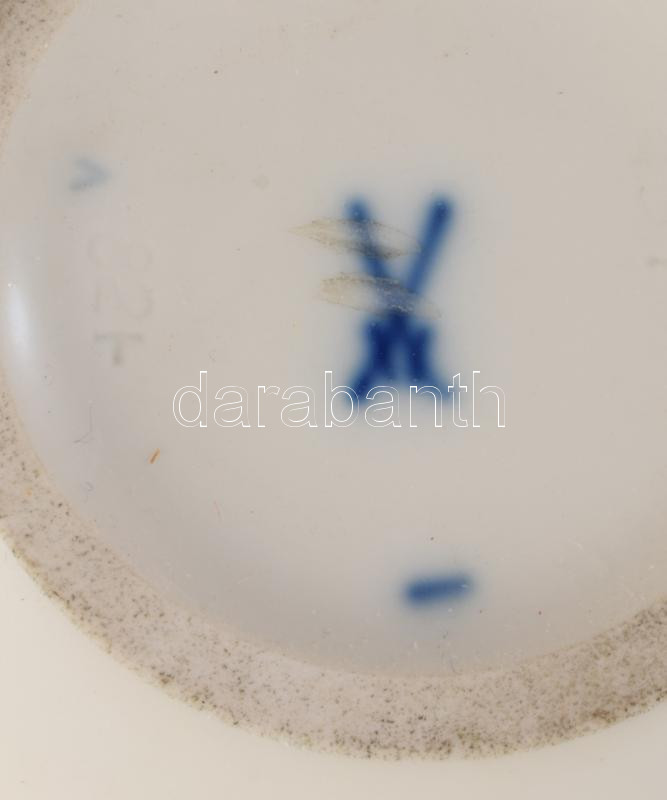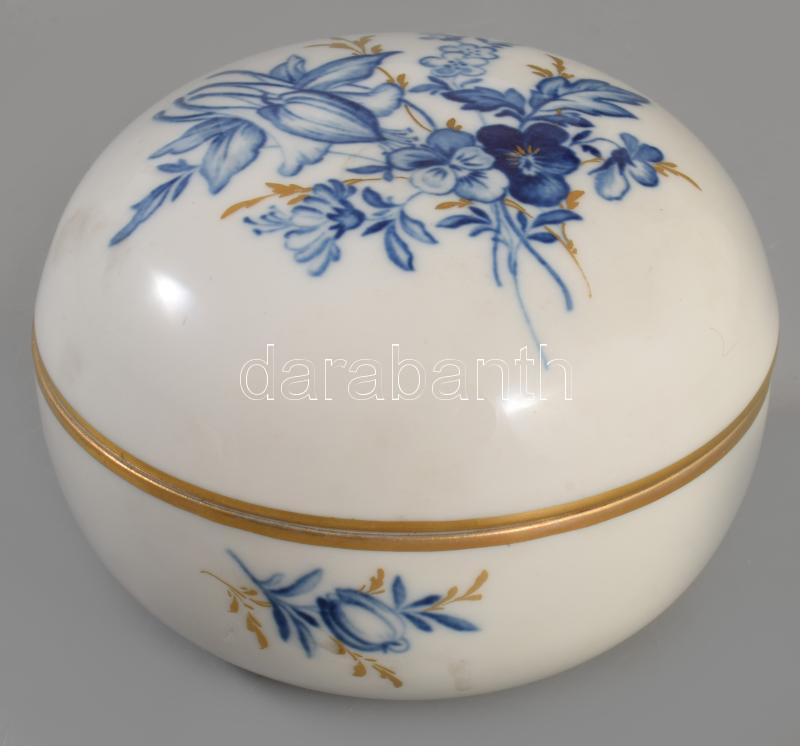 Meissen kék virágmintás bonbonier. Jelzett, két vonallal csiszolt kardos jelzés, hibátlan, d: 9 cm