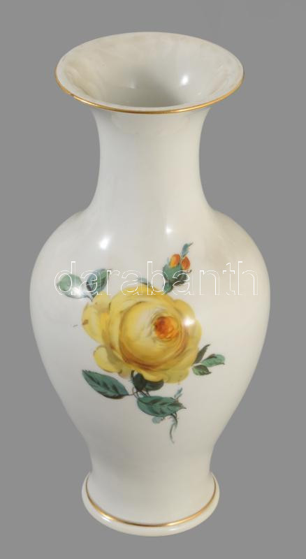 Meissen sárga rózsa mintás váza. Jelzett, kardos jelzés, szájánál kis lepattanással, m: 22,5 cm