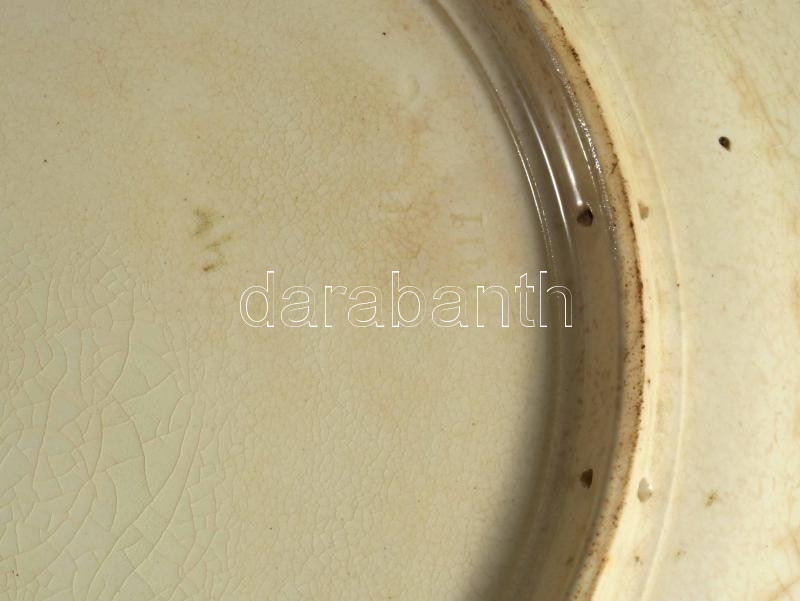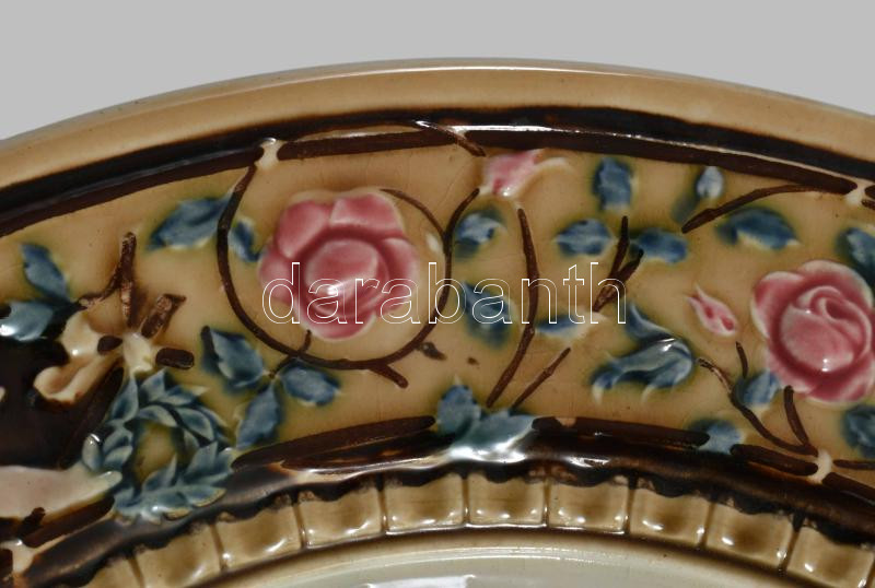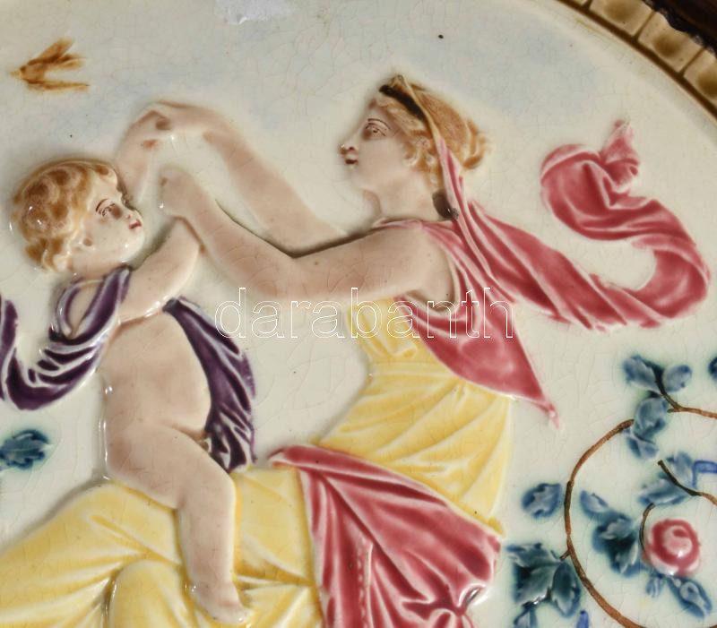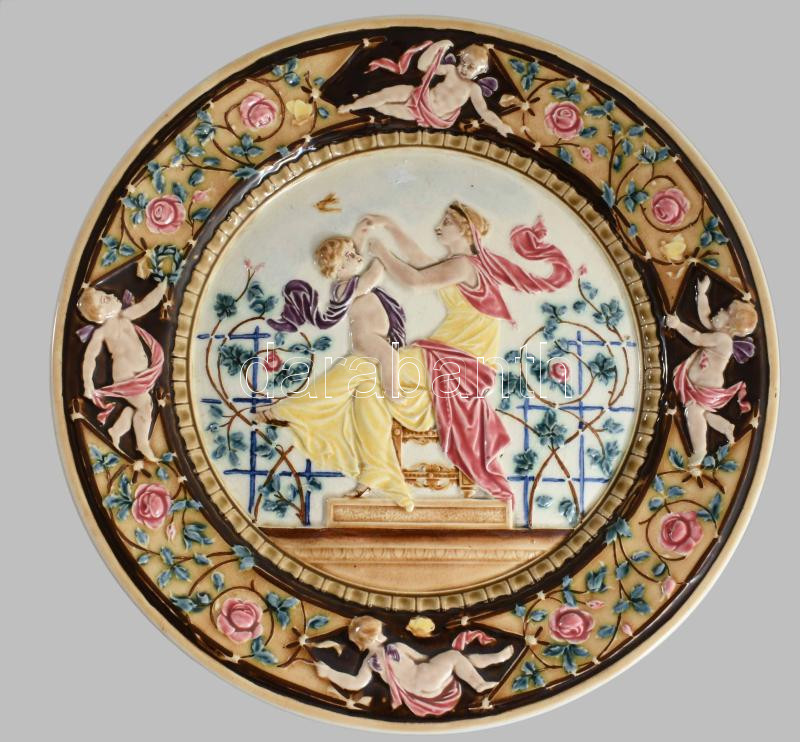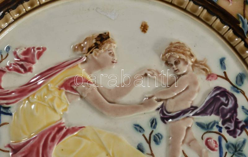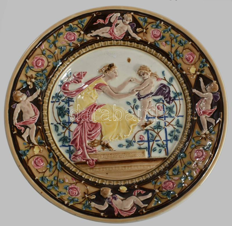 Puttókkal incselkedő múzsa. Fajansz dísztányérpár. cca 1880, Németország vagy Znojmo. Kézzel festett, jelzett, minimális mázhibával d: 36 cm