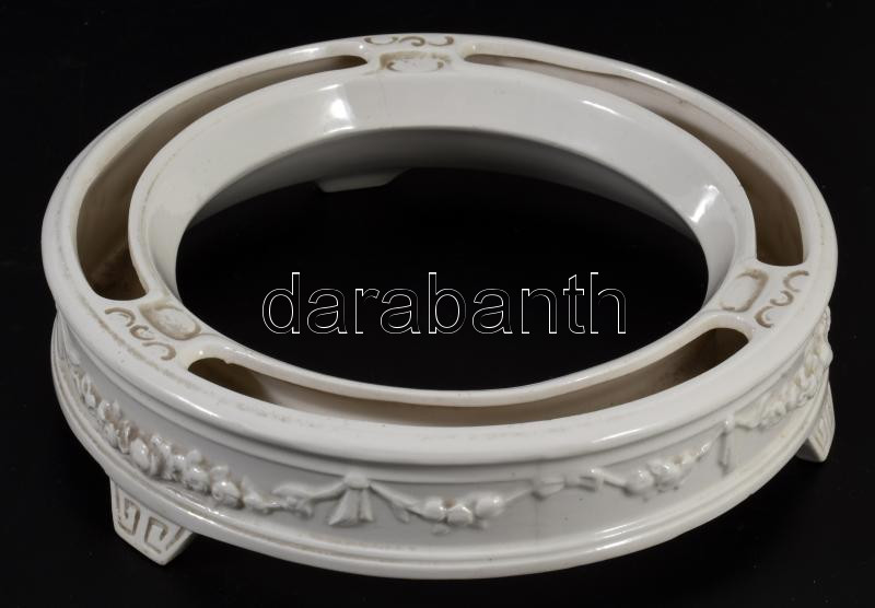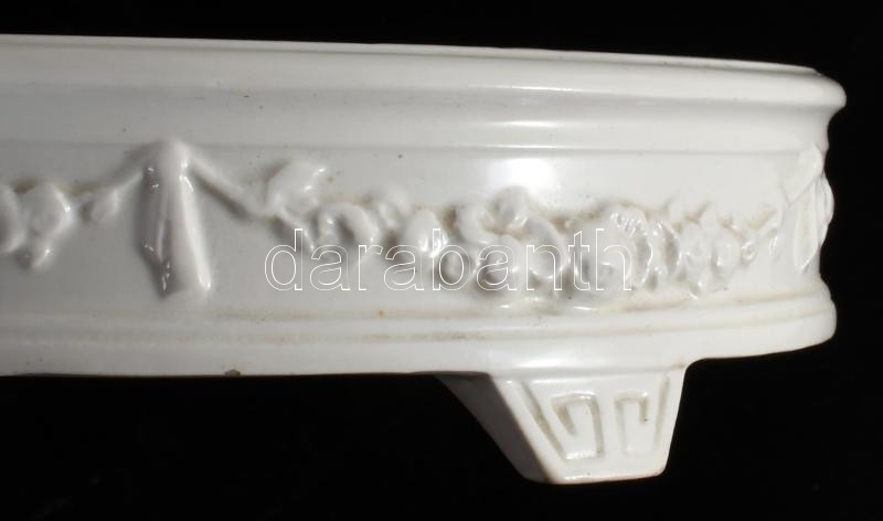 Szecessziós fajansz virágtartó, plasztikus díszítéssel, kis felületi sérüléssel, repedéssel, d: 18 cm