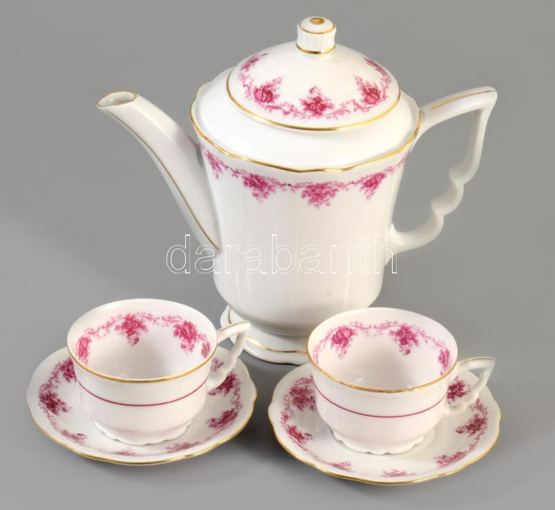 Zsolnay két személyes mokkás készlet, Kanna, két csésze, aljjal. ifj Grünwald Mór jelzéssel