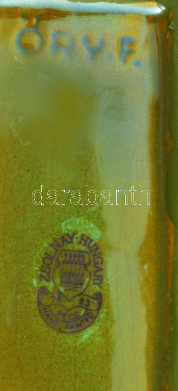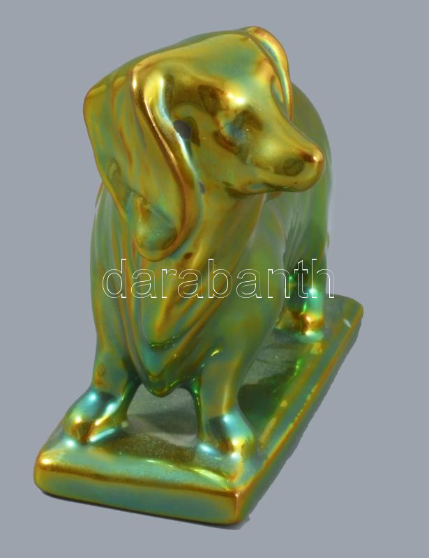Zsolnay kisplasztika - Tacskó kutya. Eozin mázakkal bevont fehérfajansz, jelzett, hibátlan, 13x8 cm