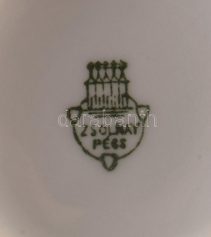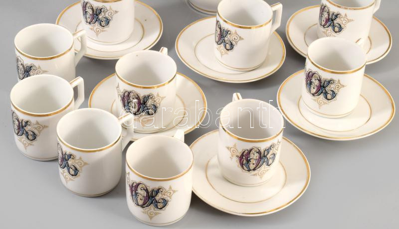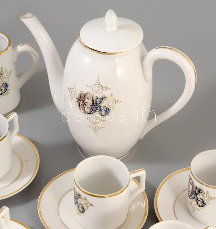 Zsolnay mokkás készlet monogramos festéssel. 10 csésze, 6 db alj, kanna, tejkiöntő. Kézzel festett, jelzett, kisebb hibákkal.