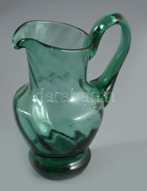 Parádi csavartbordás zöld üveg kiöntő, hibátlan, m: 14,5 cm