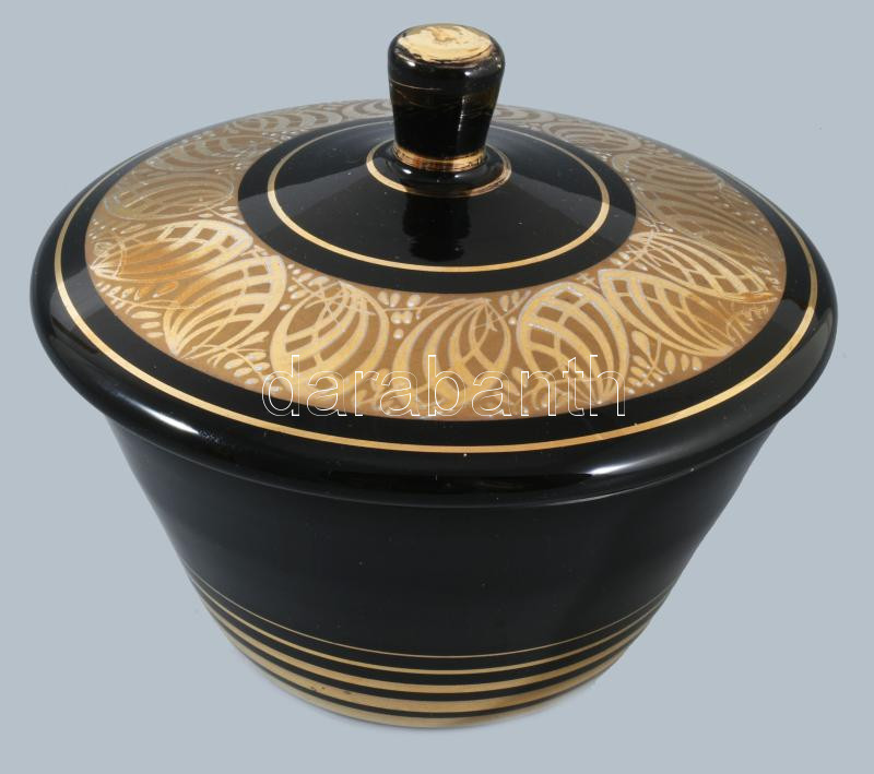 cca 1930 Aranyozott hialitüveg fedeles edény, kopással, d: 15 cm, m: 13 cm