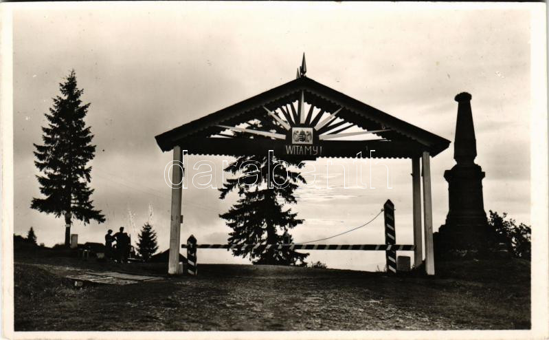 Vereckei-hágó, Veretskyy pereval, Verecke Pass, Serednioveretskyy; Az ezeréves határ Vereckénél a határkővel, magyar címer, sorompó, győzelmi kapu, emlékobeliszk / Hungarian-Polish historical border, Hungarian coat of arms, barrier, "Witamy!" ("Welcome!" in Polish), memorial obelisk
