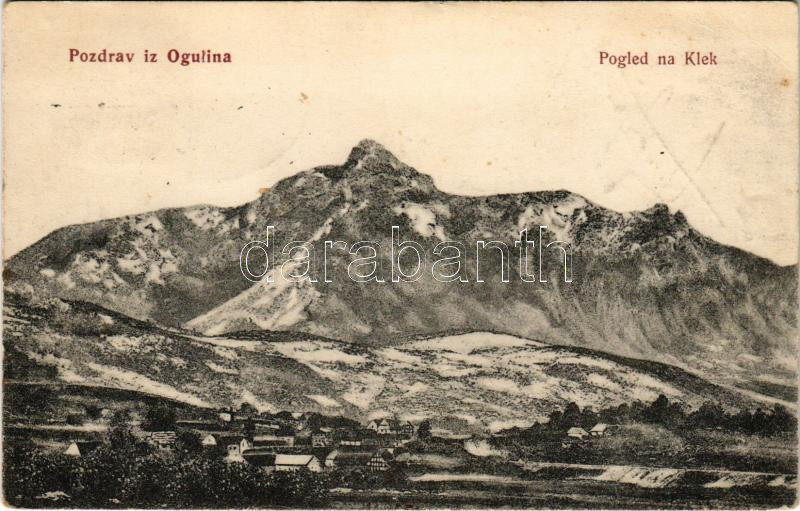 1913 Ogulin, Pogled na Klek / látkép a Klek hegycsúccsal. Iso Unterberger kiadása / general view with mountain (kis szakadás / small tear)