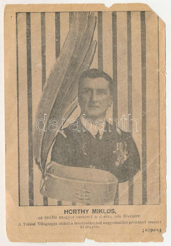 Horthy Miklós az önálló magyar nemzeti hadsereg hős fővezére. A Tolnai Világlapja ebből a levelezőlapból negyedmillió példányt osztott ki ingyen / Hungarian irredenta propaganda, Regent Horthy (b)