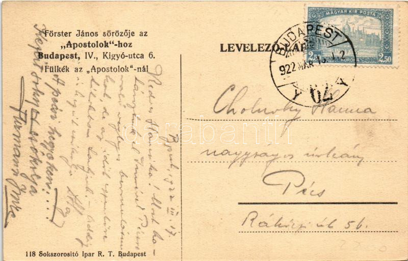 1922 Budapest V. Förster János sörözÅ‘je az Apostolokhoz, fülkék az Apostoloknál, belsÅ‘. KÃgyó utca 6. A képeslap cÃmzettje csolnokosi Cholnoky Hanna (Johanna, 1906-1977), dr Cholnoky JenÅ‘ földrajztudós unokahúga. (EK)