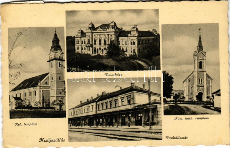 1940 Kisújszállás, református templom, városháza, római katolikus templom, vasútállomás. Aigner Lajos kiadása + "Kisújszállás pu. szekrényből" (EK)