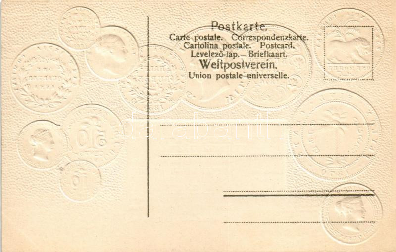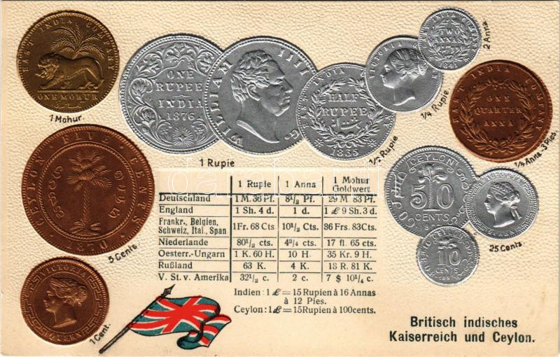 Britisch indisches Kaiserreich und Ceylon / British India and Ceylon (Sri Lanka) - set of coins, currency exchange chart and flag. Emb. litho (lyuk / pinhole)