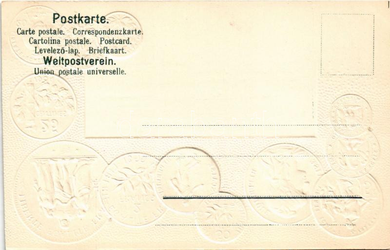 Frankreich / Francia / Set of coins, currency exchange chart and flag of France. H.S.M. Emb. litho (lyukak / pinholes)