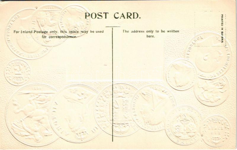 Grossbritanien und Irland. Münzenkarte mit Nationalflagge / Great Britain and Ireland - set of coins, currency exchange chart and flag. Emb. litho (lyukak / pinholes)