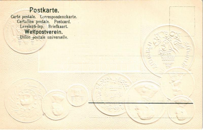 Siam / Set of coins, currency exchange chart and flag of Siam. H.S.M. Emb. litho (lyukak / pinholes)