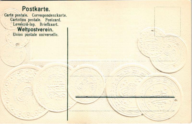 Türkei. Münzenkarte mit Nationalflagge / Turkish set of coins, currency exchange chart and flag. H.S.M. Emb. litho (lyuk / pinhole)