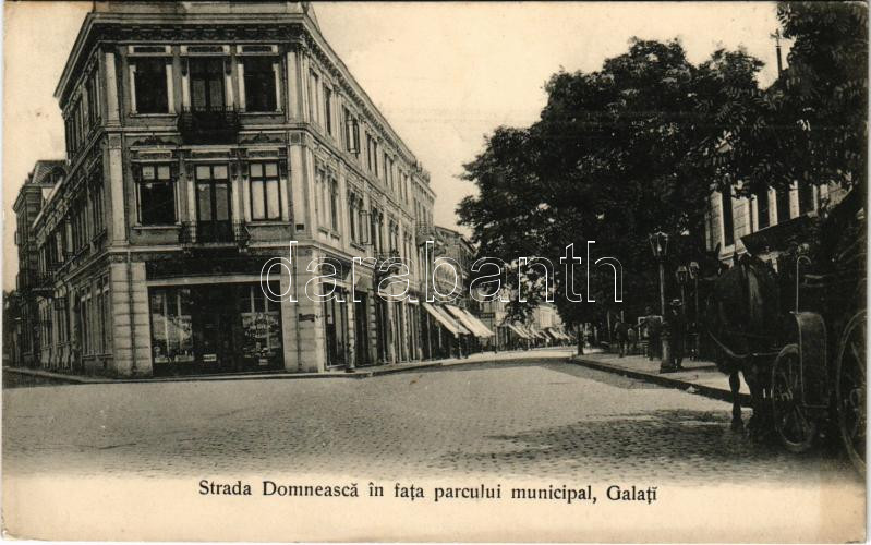 1910 Galati, Galatz; Strada Domneasca in fata parcului municipal. Negoescu & Manitiu / street, park, pharmacy (EK)