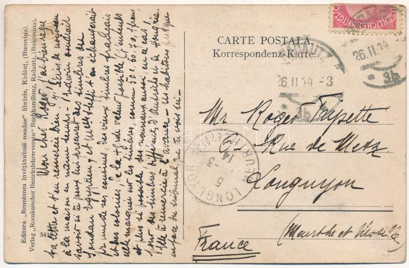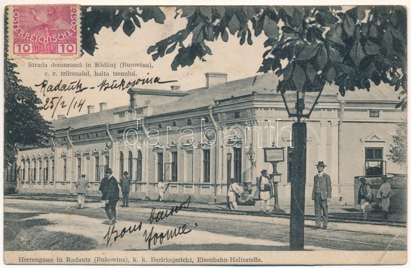 1914 Radauti, Radóc, Radautz (Bukovina, Bucovina, Bukowina); Strada domneasca c. r. tribunalul, halta trenului / Herrengasse, k.k. Bezirksgericht, Eisenbahn-Haltestelle / street, urban railway stop (r)