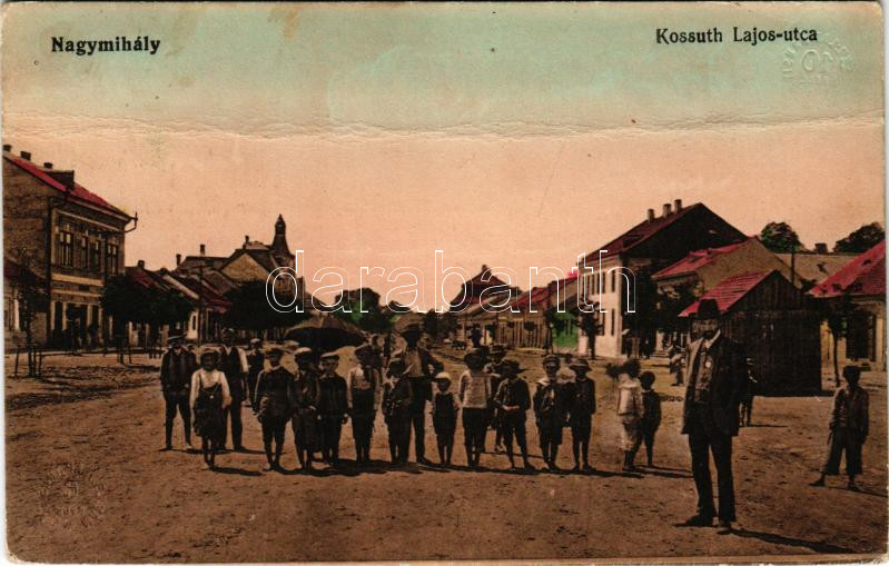 1915 Nagymihály, Michalovce; Kossuth Lajos utca, üzletek. Vasúti levelezőlapárusítás 2444. / street view, shops (fa)