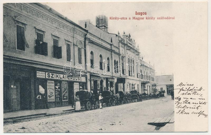 1915 Lugos, Lugoj; Király utca a Magyar Király szállodával, Sziklai Lajos üzlete és saját kiadása / street, hotel, shop
