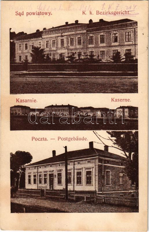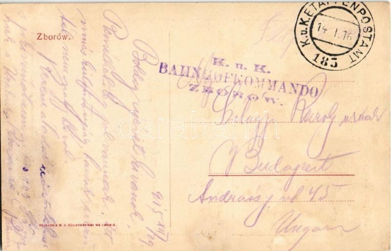 1916 Zboriv, Zborów; Sad powiatowy, Kasarnie, Poczta / K. k. Bezirksgericht, Kaserne, Postgebäude / district court, K.u.K. military barracks, post office + "K.U.K. BAHNHOFKOMMANDO ZBORÓW" "K.U.K. ETAPPENPOSTAMT 185" (Rb)