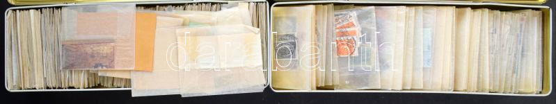 Sok ezer magyar és külföldi bélyeg pergamen tasakokban 2 db 10 x 30 cm fém Rothmans cigarettás dobozban