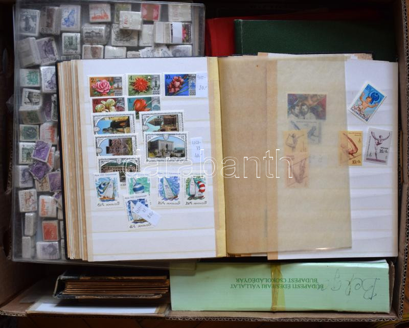 Vegyes hagyatéki anyag dobozban ömlesztve, benne magyar és külföldi bélyegek vegyesen, bündlik, kis borítékos rendező, kivágások, levelek stb. banános ládában. Érdemes átnézni!
