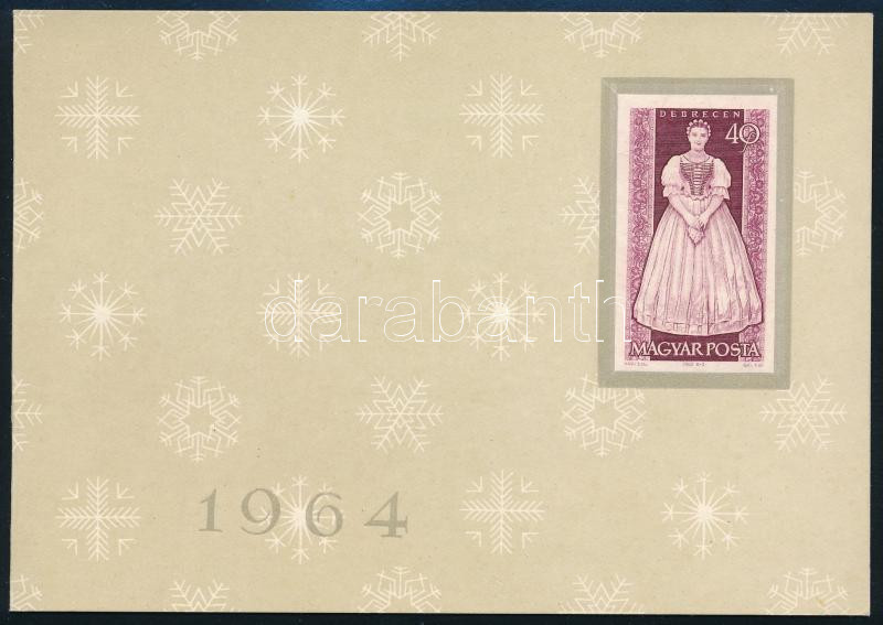 1964 Népviselet 40f réznyomatos képe barna helyett sötétibolya színben a Posta nemzetközi elszámoló részlegének újévi üdvözlő kártyáján. Eddig ismeretlen különlegesség!!!