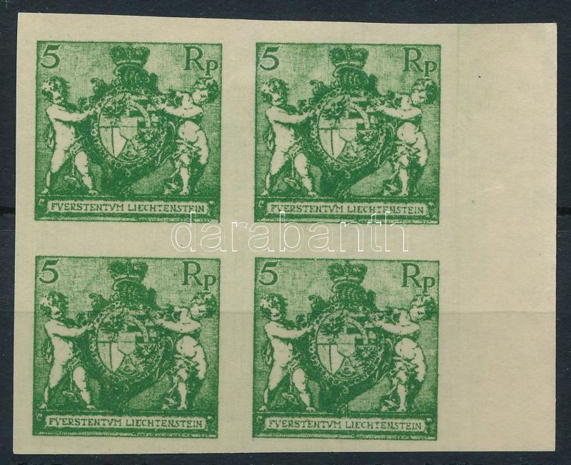 Liechtenstein 1921 Forgalmi 5Rp fogazatlan próbanyomat négyestömb Mi 48P (Mi EUR 240.-)