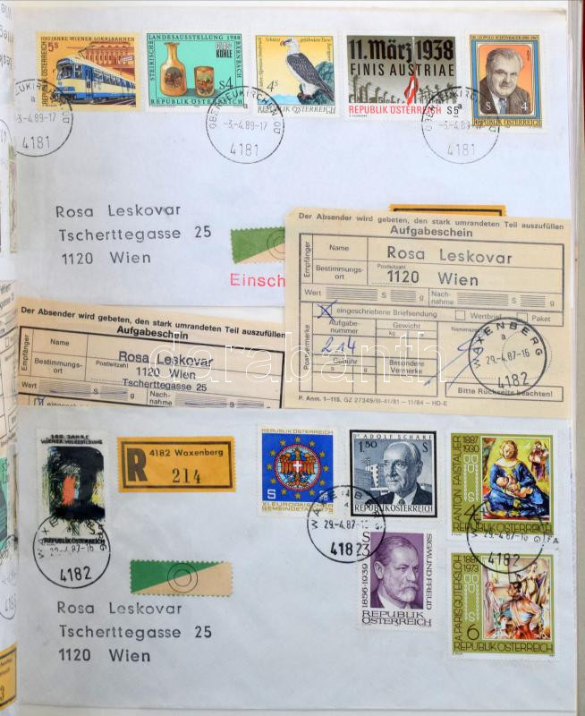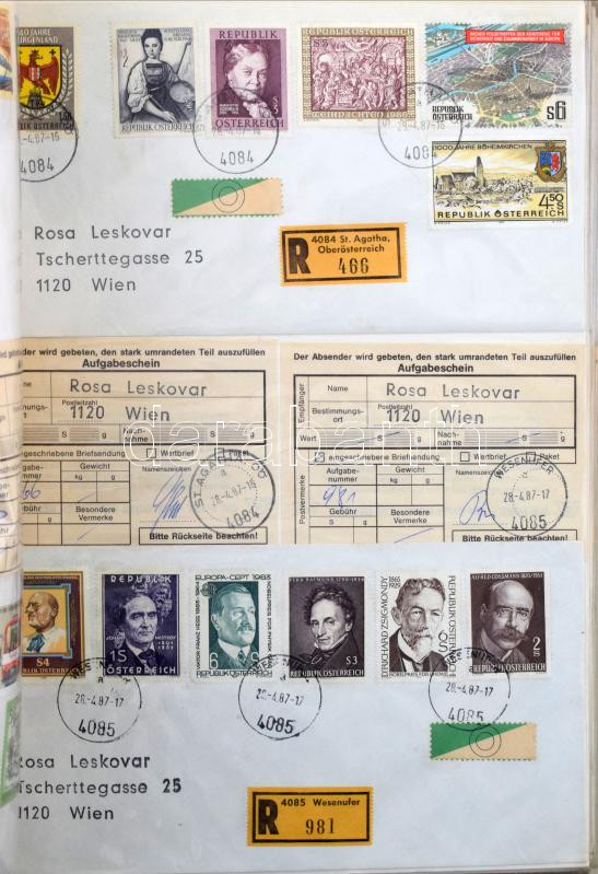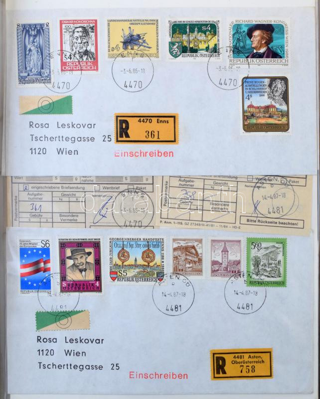 Nagy Ausztria levéltétel 900 db ajánlott levél dekoratív több bélyeges bérmentesítésekkel (összesen 6.250 db bélyeggel), minden levélhez feladó vevény, 5 iratrendezőben. Érdekes anyag!!