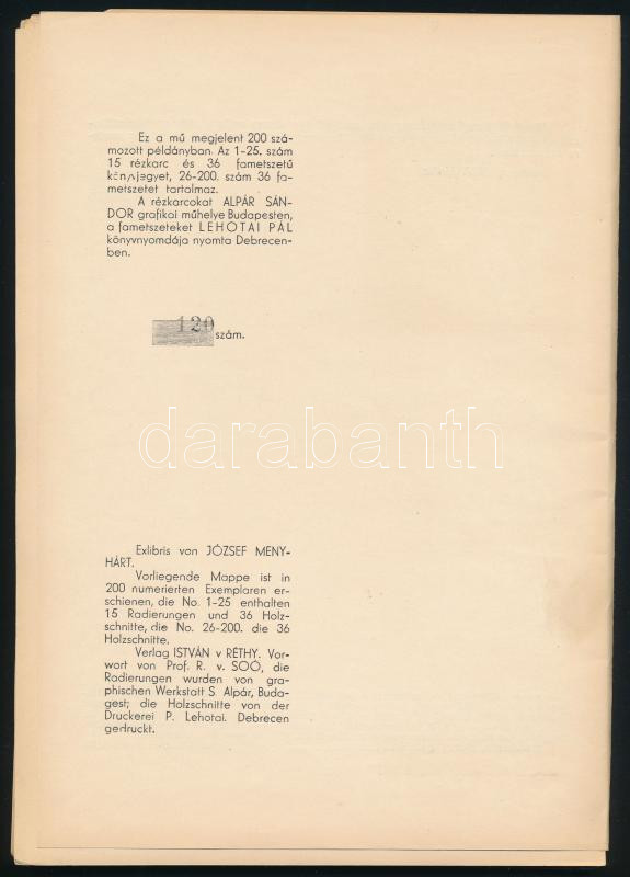 1937 Menyhárt József fametszet könyvjegyei. Dr. berei Soó Rezső egyetemi ny. r. tanár bevezetésével. A kiadó, Réthy István által DEDIKÁLT példány! [Bp.,1937,]Réthy István, (Debrecen, Lehotai Pál-ny.), 4 p.+36 t. Ez a mű megjelent 200 számozott példányban. Az 1-25. szám 15 rézkarc és 36 fametszetű könyvjegyeket, 26-200. szám 36 fametszetet tartalmaz. Számozott (120./200) példány. Kiadói félvászon mappában, kissé kopott borítóval,.