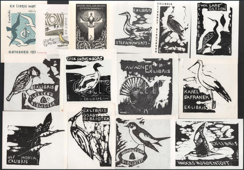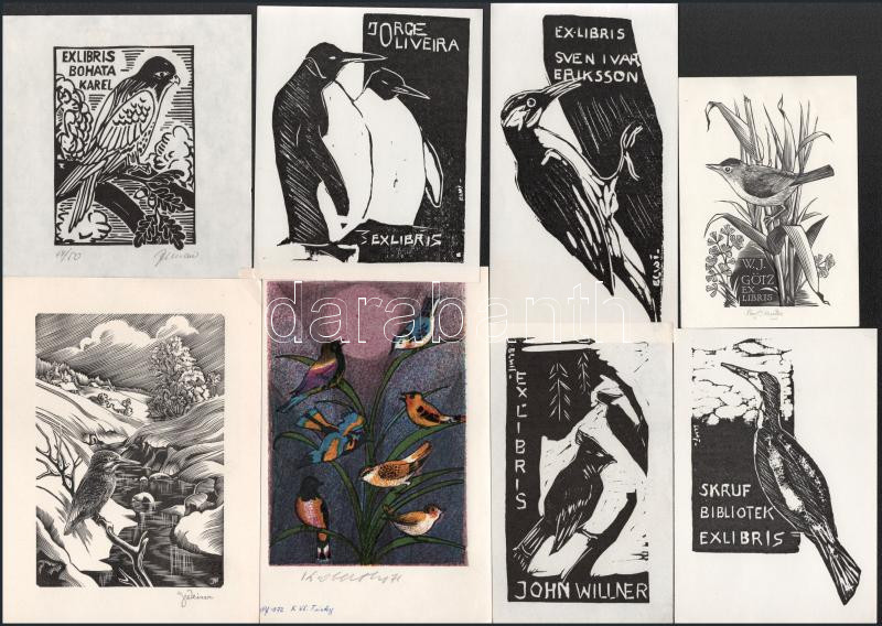 Klf. alkotók (többségében Borge Elwi Carlson): 22 db ex libris és kisgrafika madár ábrázolással. Klf. technikák, papír, részben jelzett, klf. méretekben.