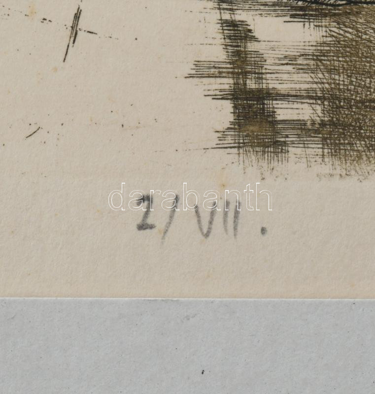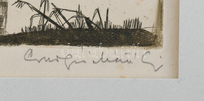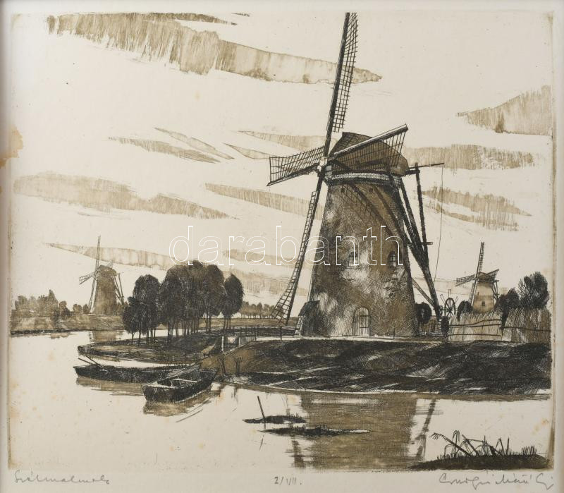 Csurgói Máté Lajos (1931-2001): Szélmalmok. Rézkarc, papír, jelzett, számozott: 2/VII. Paszpartuban. Lapszéli folttal. 24,5x29 cm