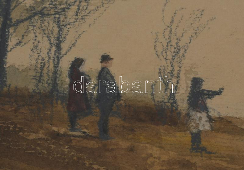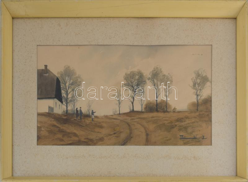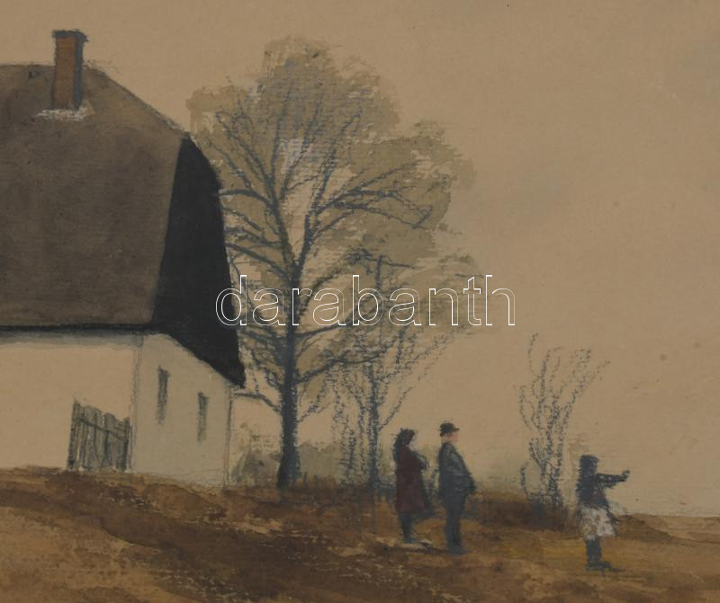Dobroszláv Lajos (1902-1987): Faluvége. Akvarell, ceruza, papír, jelezve jobbra lent, üvegezett keretben, hátoldalán Képcsarnok Vállalat címkéivel, 24×45,5 cm.
