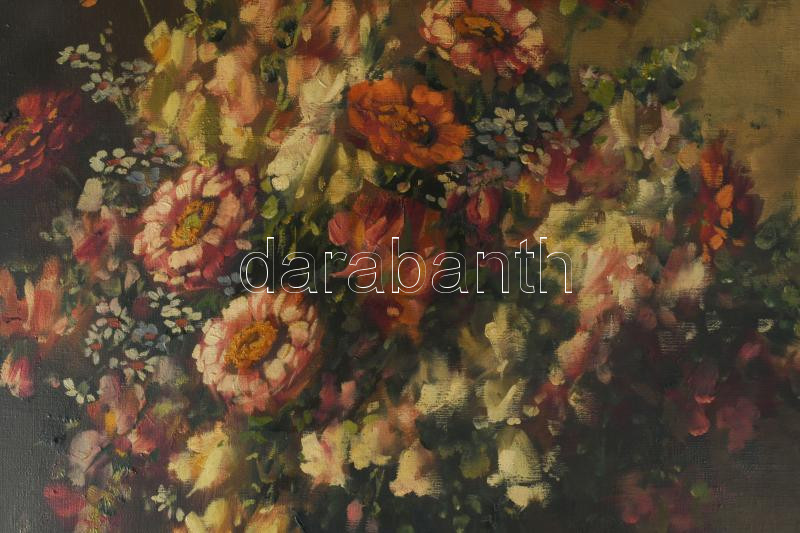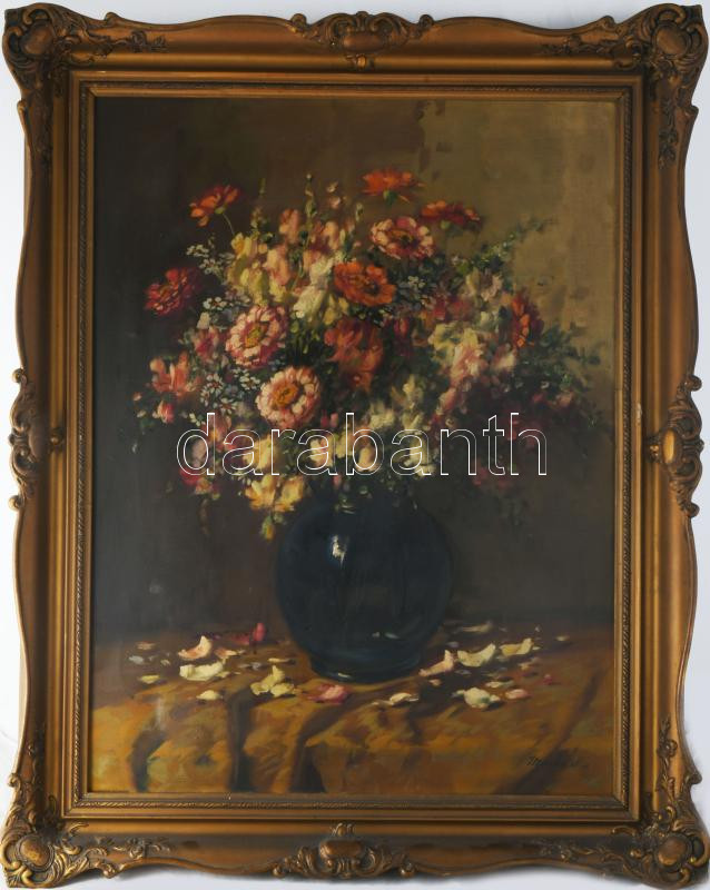 Murin Vilmos (1891-1952): Csendélet. Olaj, vászon, jelzett. Hátoldalán Dorko kassai galéria és képkeretező címkéjével valamint ismeretlen ajándékozási soraival 1942-ből. Dekoratív, korabeli fakeretben, 80x60 cm