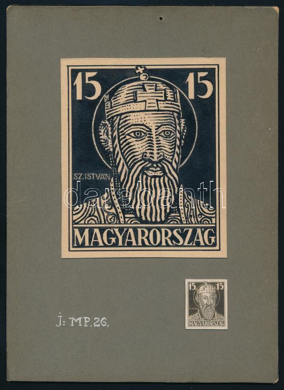 Szege Sándor (1883-1945): 15 fillér bélyeg terve Szent István portré ábrázolással, 1926 körül. Tus, papír. Jelzés nélkül. Kartonra kasírozva. 9,5x8 cm. Kartonon a kész bélyeg is szerepel!