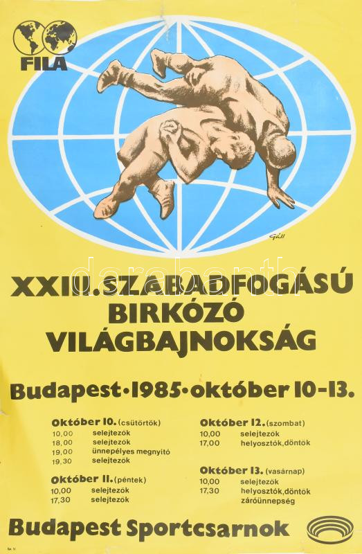 1985 XXIII. Szabadfogású Birkózó Világbajnokság a Budapest Sportcsarnokban plakát, Gáll Gyula grafikája, gyűrődésekkel, szakadásokkal, 49×32 cm