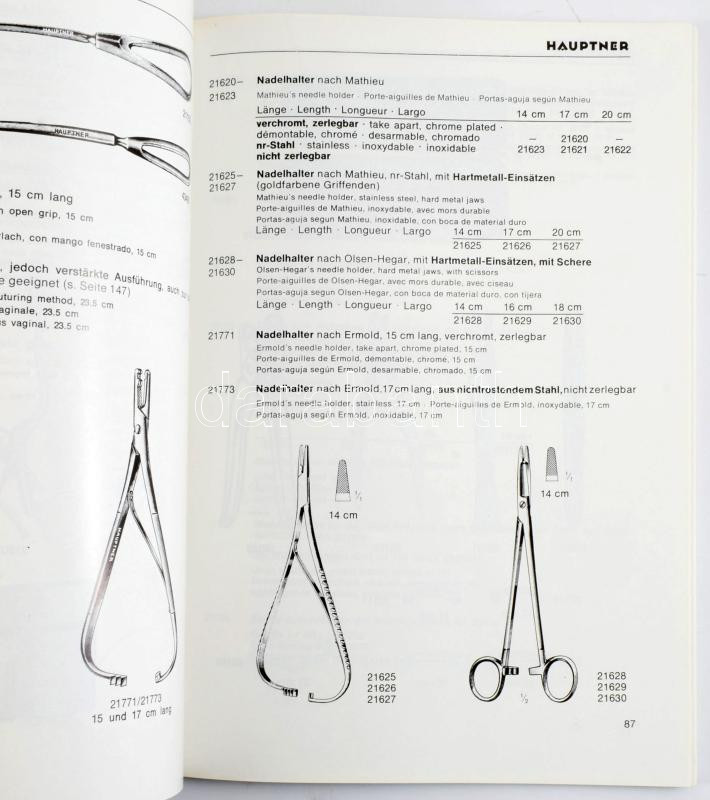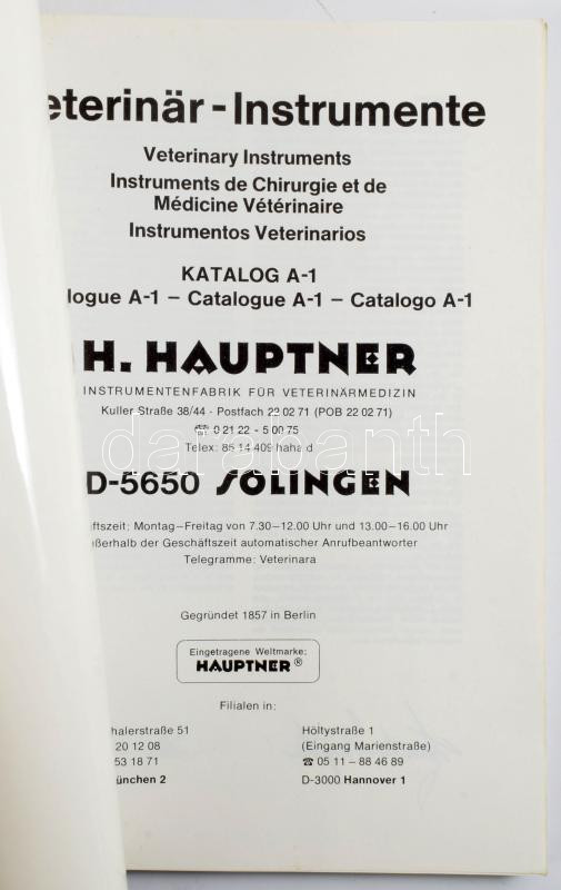 cca 1970-1980 H. Hauptner Veterinär-Instrumente Katalog A-1. Német, angol, francia és spanyol nyelvű állatorvosi eszköz árjegyzék, fekete-fehér illusztrációkkal, karcos borítóval, 200 p.
