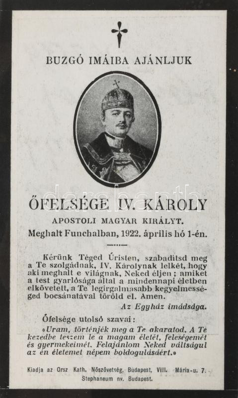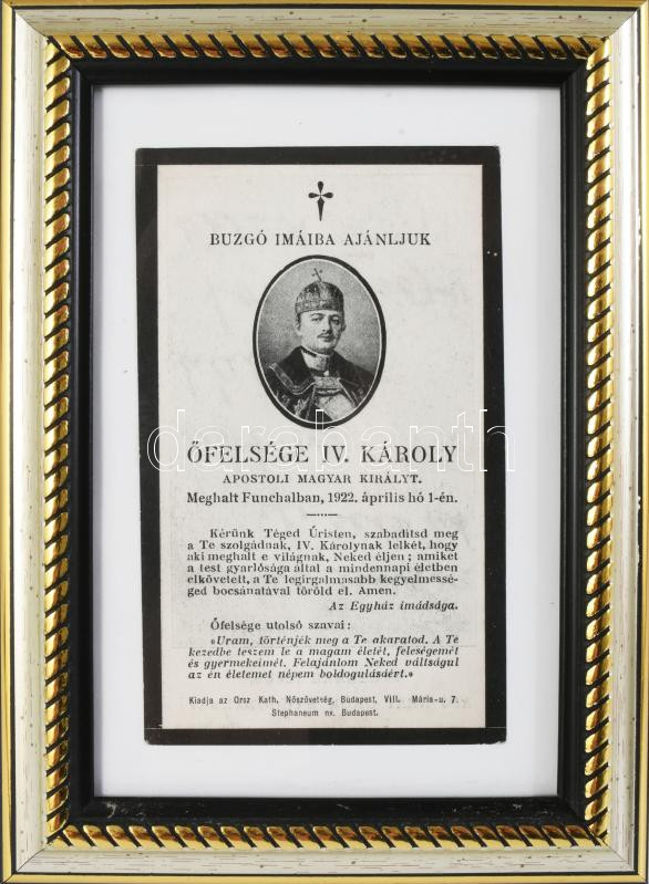 1922 IV. Károly halálozási értesítője, szentkép alakú, gyászkerettel, kiadja: Országos Katholikus Nőszövetség, Bp., Stephaneum-ny., üvegezett fa keretben: 7x12 cm, keret: 18x13 cm