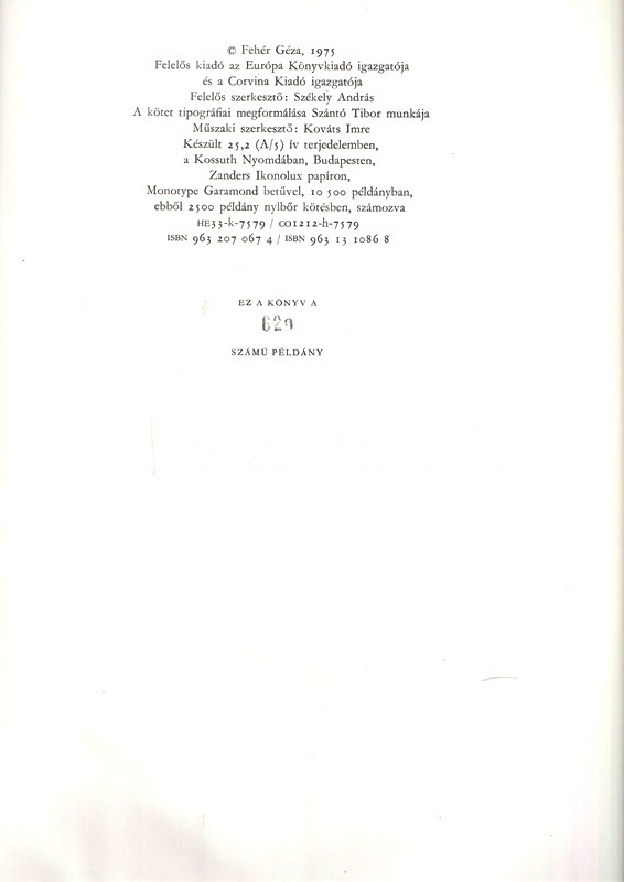 Bibliofil képzőművészeti albumunk kolofonja: "A kötet tipográfiai megformálása Szántó Tibor mnkája. Készült a Kossuth Nyomdában, Zanders Ikonolux papíron, Monotype Garamond betűvel, 10,500 példányban, ebből 2500 példány nyl-bőr kötésben, számozva. Ez a könyv a 629. számú példány".