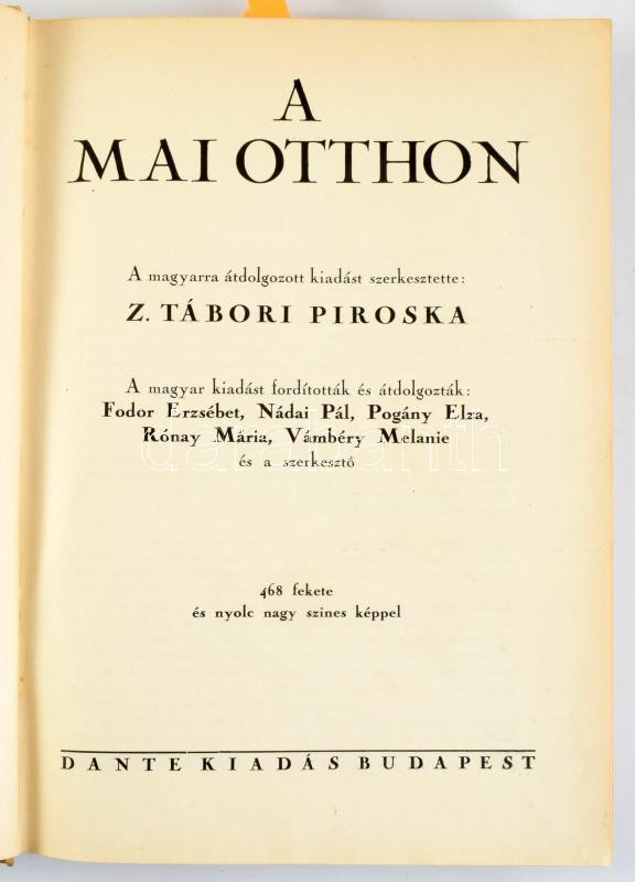 A mai otthon. Összeáll.: Mária Mathilde Mandl. A magyar átdolgozott kiadást szerk.: Z. Tábori Piroska. A magyar kiadást ford. és átdolgozták: Fodor Erzsébet, Nádai Pál, Pogány Elza, Rónay Mária, Vámbéry Melanie és a szerkesztő. Bp.,[1928.],Dante, (Wodianer F. és Fiai-ny.), 392+159+1 p. + 8 t. A borító Végh Gusztáv munkája. Gazdag nagyrészt fekete-fehér képanyaggal, és 8 színes táblával, valamint Biczó András könyvillusztrációival illusztrált. Kiadói aranyozott, festett egészvászon-kötés, kissé kopott borítóval, kissé sérült gerinccel.
