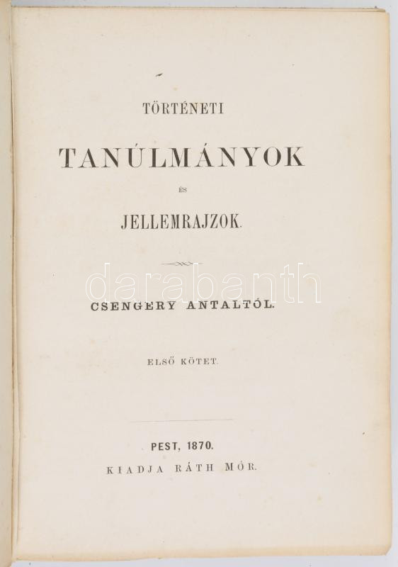 Csengery Antal: Történeti tanúlmányok és jellemrajzok. I. köt. Pest, 1870, Ráth Mór, IV+409+[3] p. Első kiadás. Aranyozott gerincű egészvászon-kötésben, kissé viseltes borítóval és gerinccel, helyenként kissé foltos lapokkal.