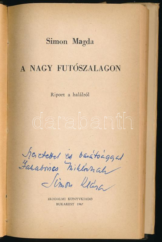 Simon Magda: A nagy futószalagon. Riport a halálról. Bukarest, 1967, Irodalmi Könyvkiadó. Simon Klára ajándékozási soraival. 156p. Kiadói egészvászon kötés, sérült papÃr védÅ‘borÃtóval, jó állapotban.