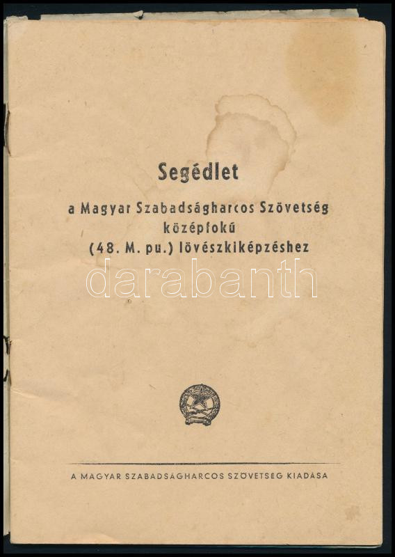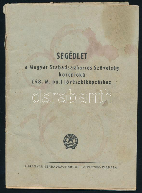 Segédlet a Magyar Szabadságharcos Szövetség középfokú (48. M. pu.) lövészkiképzéséhez. Bp., [1954], Magyar Szabadságharcos Szövetség, 48 p. Kiadói tűzött papírkötés, a tűzéstől részben elváló borítóval, foltos.