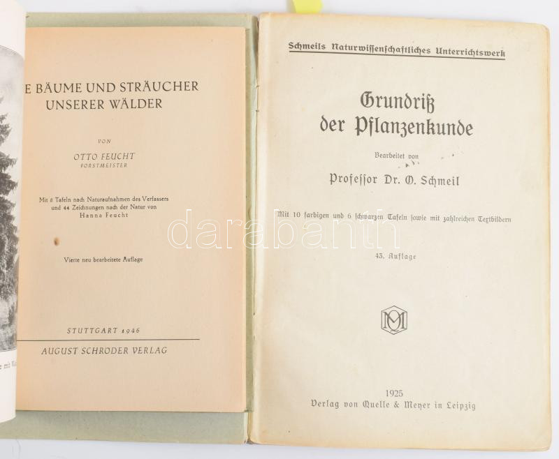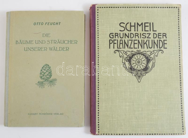 Otto Feucht: Die Bäume und Sträucher unserer Wälder. Stuttgart, 1946, August Schröder. Német nyelven. Fekete-fehér képtáblákkal illusztrált. Kiadói félvászon-kötésben, kissé kopott borítóval. + O. Schmeil: Grundriß der Pflanzenkunde. Leipzig, 1925, Quelle &Meyer. Német nyelven. Fekete-fehér képanyaggal és színes táblákkal illusztrált. Kiadói félvászon-kötésben, a gerincen kis sérüléssel, kissé kopott borítóval.