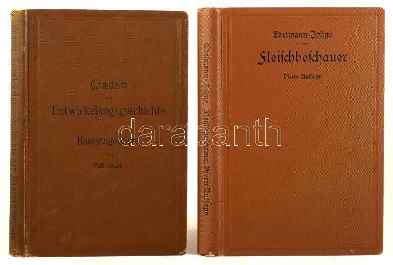 Richard Edelmann: Johnes Fleischbeschauer. Leitfaden für den Unterricht der nichttierärztlichen Fleischbeschauer ... Vierte Auflage, neuearbeitet von Dr. - - . Berlin, 1913, Paul Parey. Német nyelven. Fekete-fehér szövegközti képanyaggal illusztrált. Kiadói egészvászon-kötés, ceruzás bejelölésekkel, aláhúzásokkal és bejegyzésekkel. + Robert Bonnet: Grundriss der Entwickelungsgeschichte der Haussäugethiere. Berlin, 1891, Paul Parey. Német nyelven. Fekete-fehér szövegközti képanyaggal illusztrált. Kiadói egészvászon-kötés, ceruzás aláhúzásokkal.