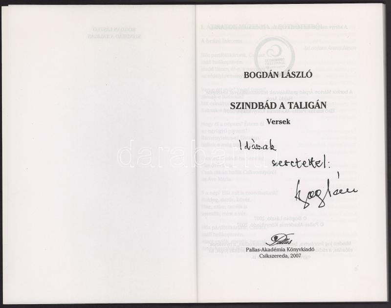 Bogdán László: Szindbád a taligán. Versek. A szerző, Bogdán László (1948-2020) erdélyi magyar költő, író, újságíró által dedikált példány! Csíkszereda, 2007, Pallas-Akadémia, 103+[1] p. Kiadói papírkötés.