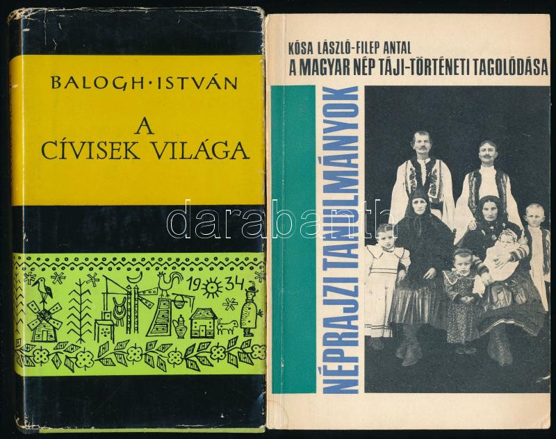 2 db néprajzi könyv: Balogh István: A cívisek világa. (Debrecen néprajza.) Bp., 1973, Gondolat. Fekete-fehér képekkel illusztrálva. Kiadói félvászon-kötés, kissé viseltes kiadói papír védőborítóban. Megjelent 3500 példányban. + Kósa László - Filep Antal: A magyar nép táji-történeti tagolódása. Néprajzi tanulmányok. Bp., 1975, Akadémiai Kiadó. Kiadói papírkötés, kissé viseltes borítóval.