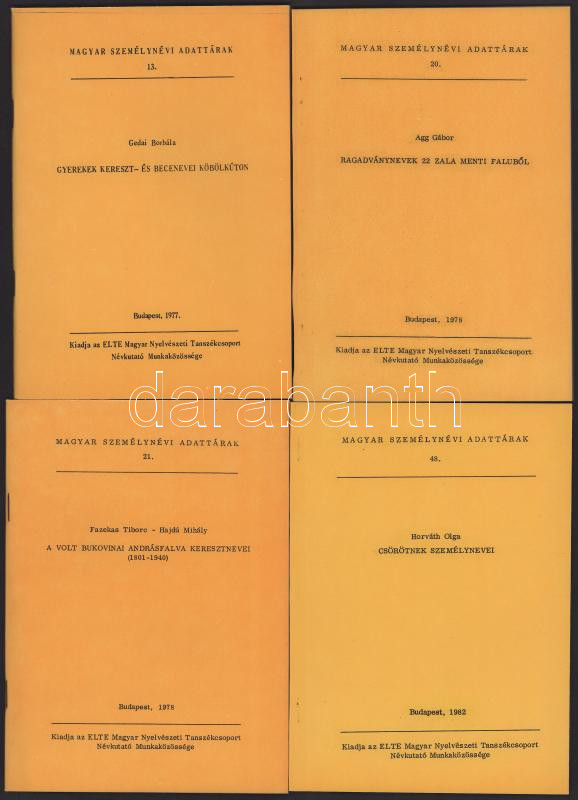 Magyar Személynévi Adattárak 13., 20., 21., 48. Bp., 1977-1982. Megjelent 250 példányban. Kiadói papírkötés, jó állapotban.