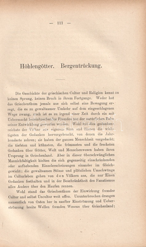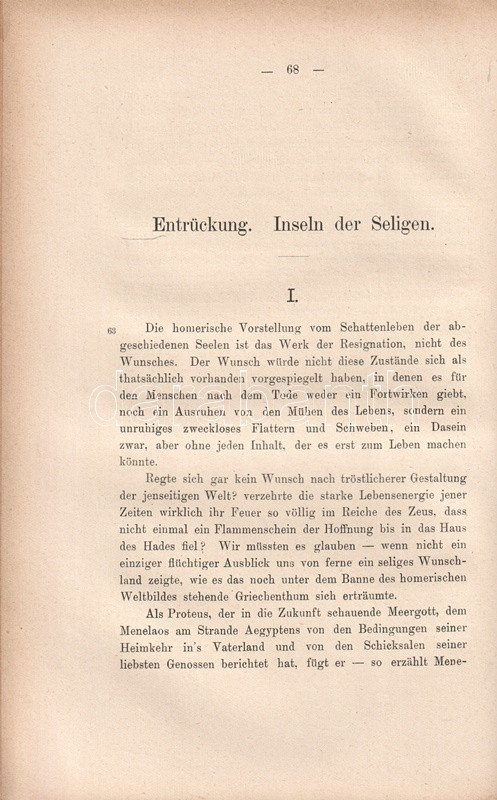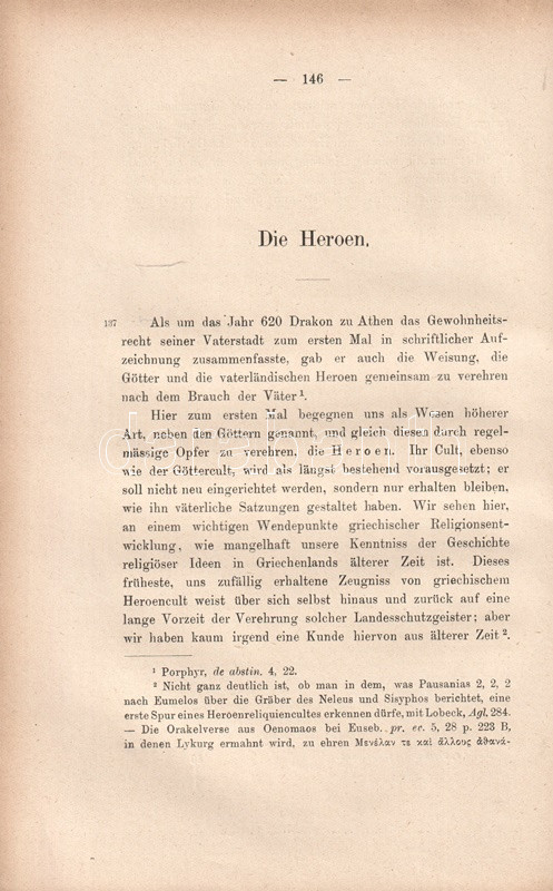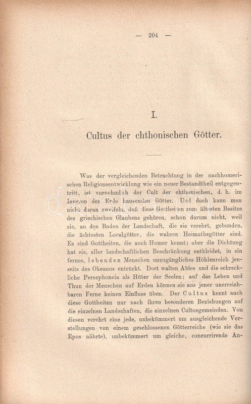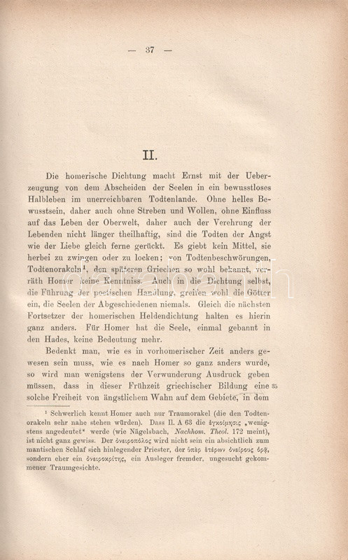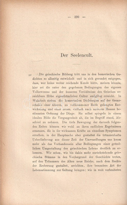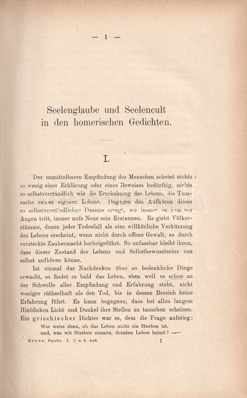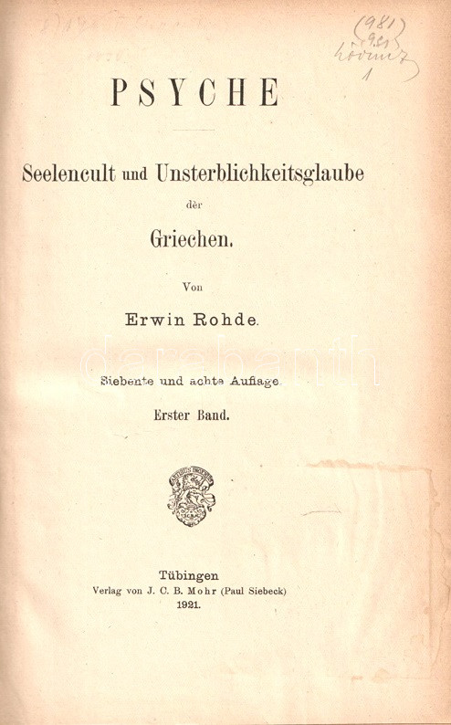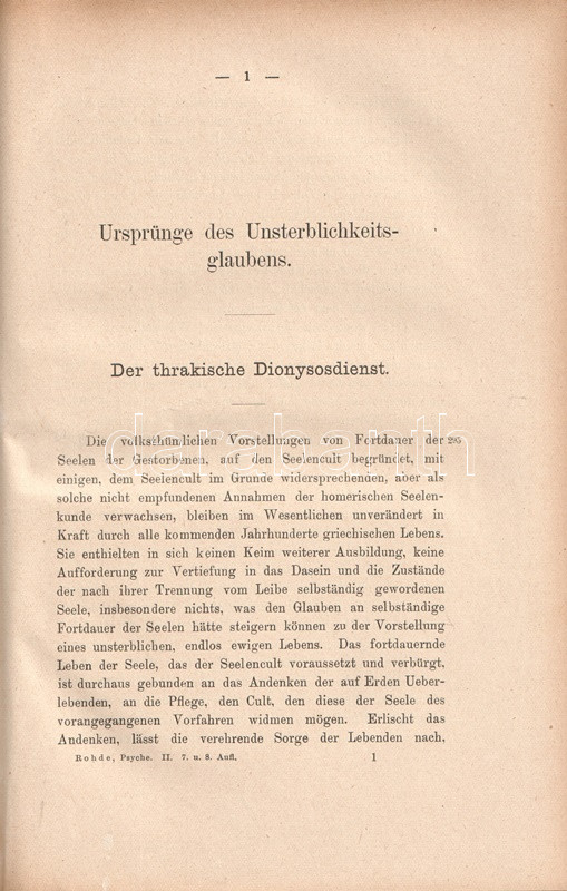 Erwin Rohde (1845-1898) német klasszika-filológus, egyetemi tanár. A komoly filológiai apparátussal készült munka az ókori görög vallás kultikus gyakorlatát, valamint a lélek halhatatlanságára vonatkozó tanításait vizsgálja a Homérosz előtti időktől a filozófusok koráig. A mű első kiadása 1894-ben jelent meg, példányunk az egyesített 7-8. kiadásból való.