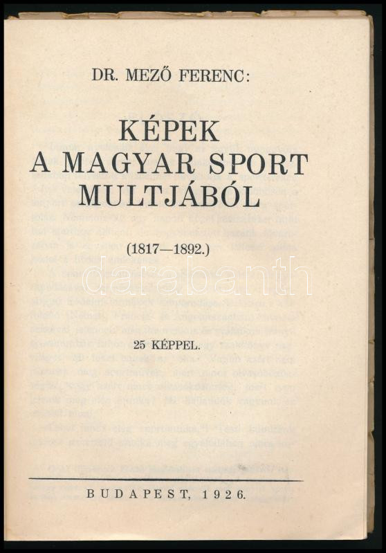 MezÅ‘ Ferenc: Képek a magyar sport multjából (1817-1892). Középfokú Iskolák Sportkörei Országos Szövetségének könyvtára. Bp., 1926, Hornyánszky-ny., 197+[3] p. Kiadói papÃrkötés, sérült borÃtóval, tulajdonosi névbejegyzéssel.